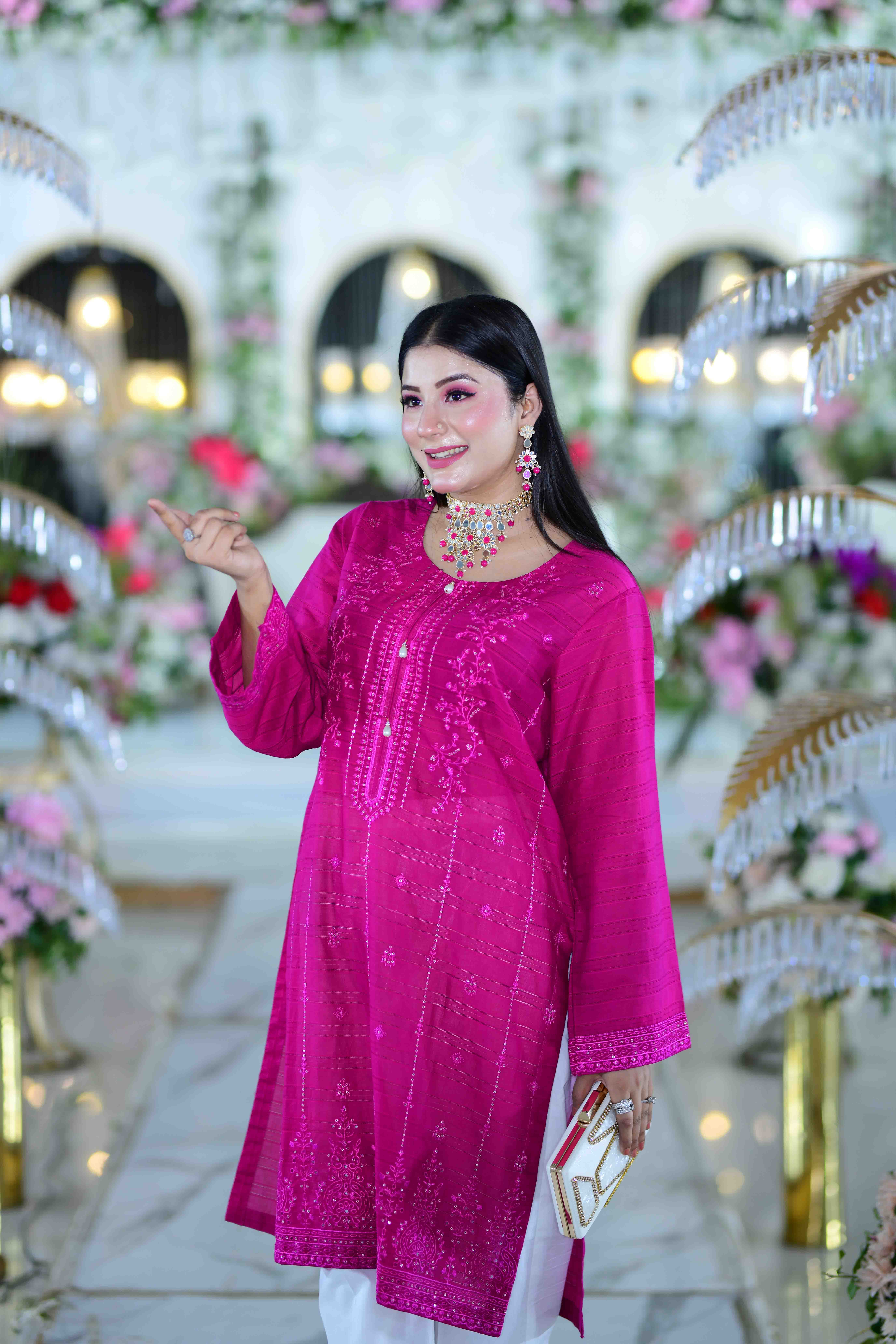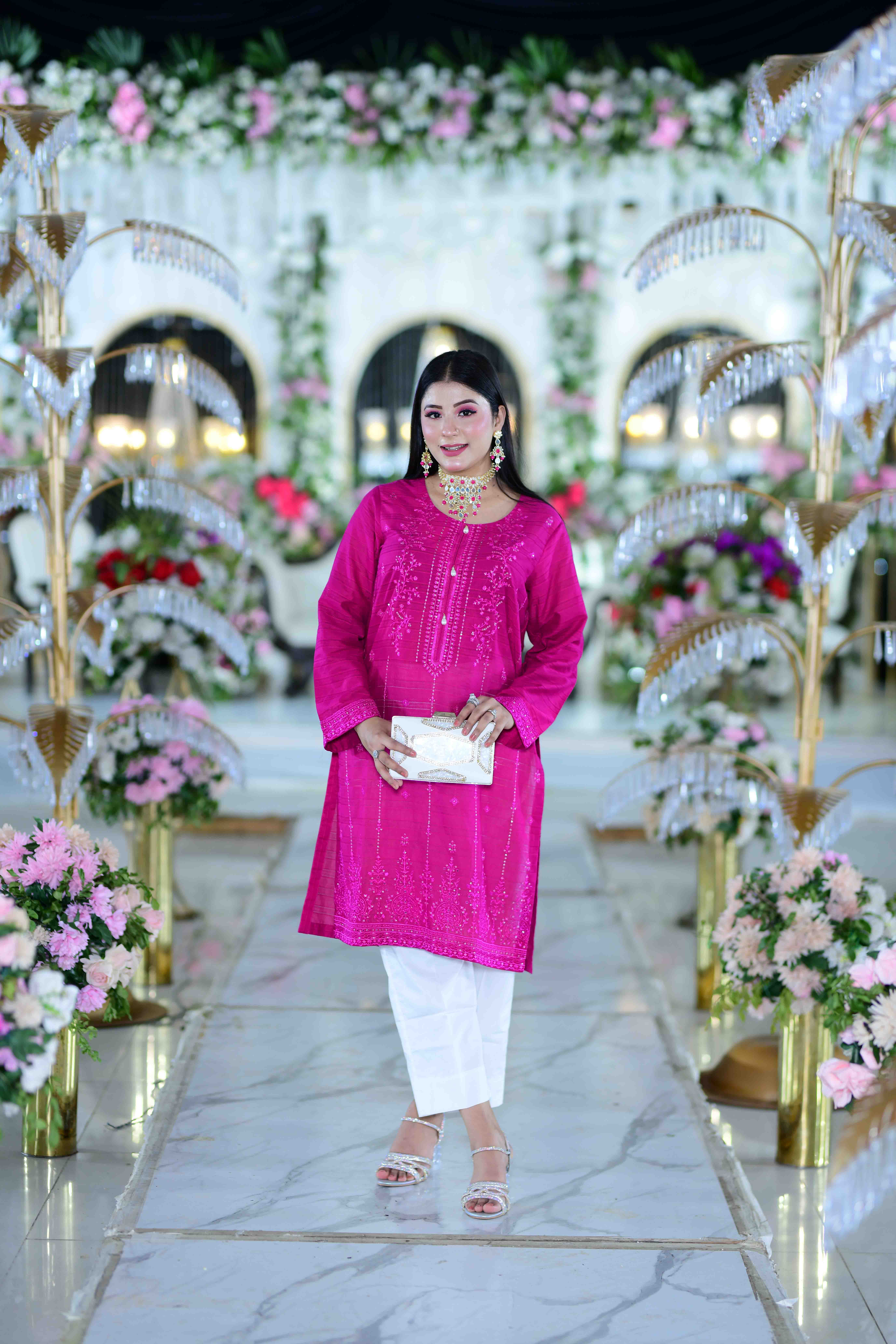 This exquisite dress set combines traditional elegance with modern sophistication. The shirt is crafted from premium imported Satin lawn fabric in a vibrant pink hue, adorned with intricate elegance embroidery that enhances its luxurious appeal. Paired with pure white cotton trouser, this ensemble offers a perfect blend of comfort and style.
