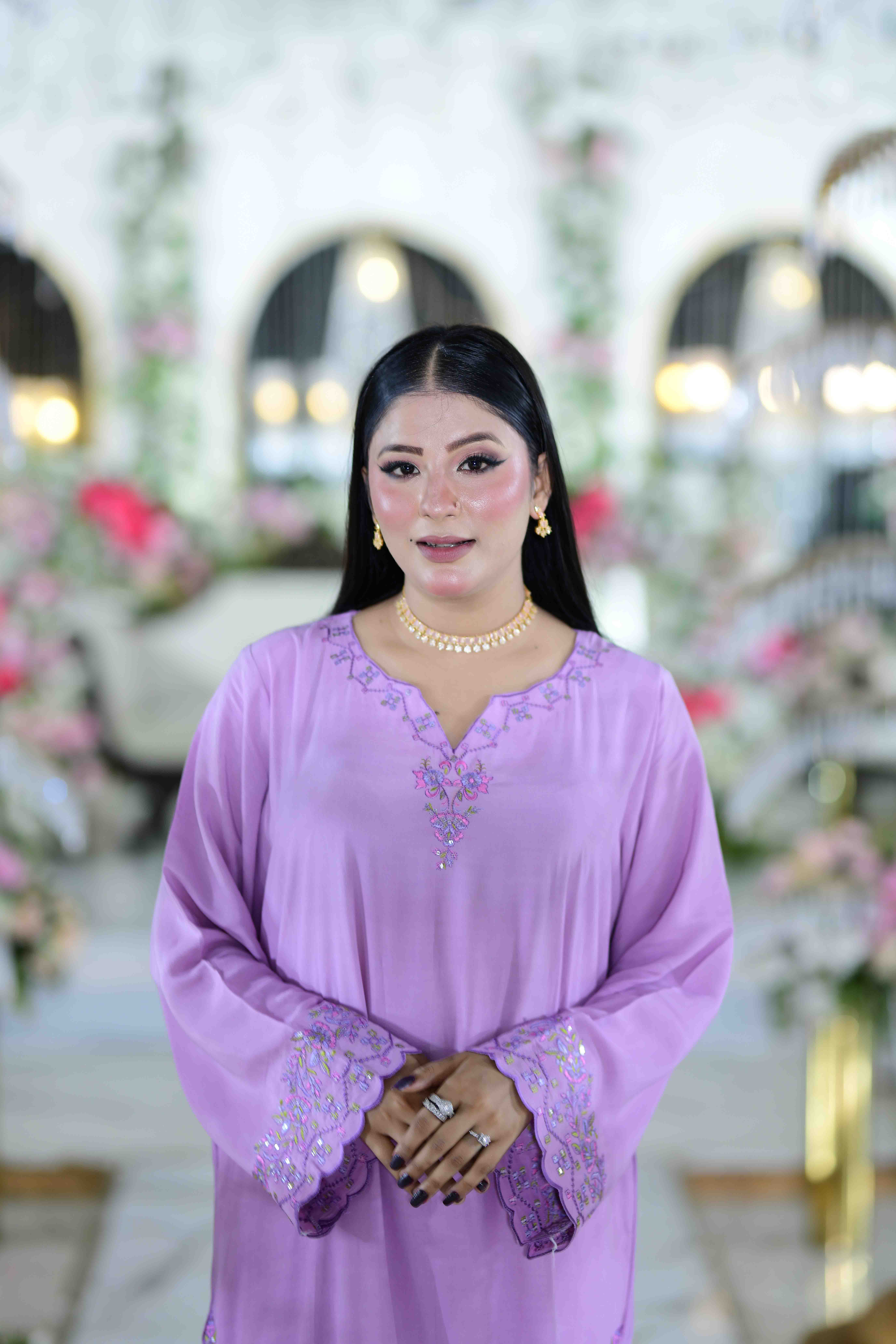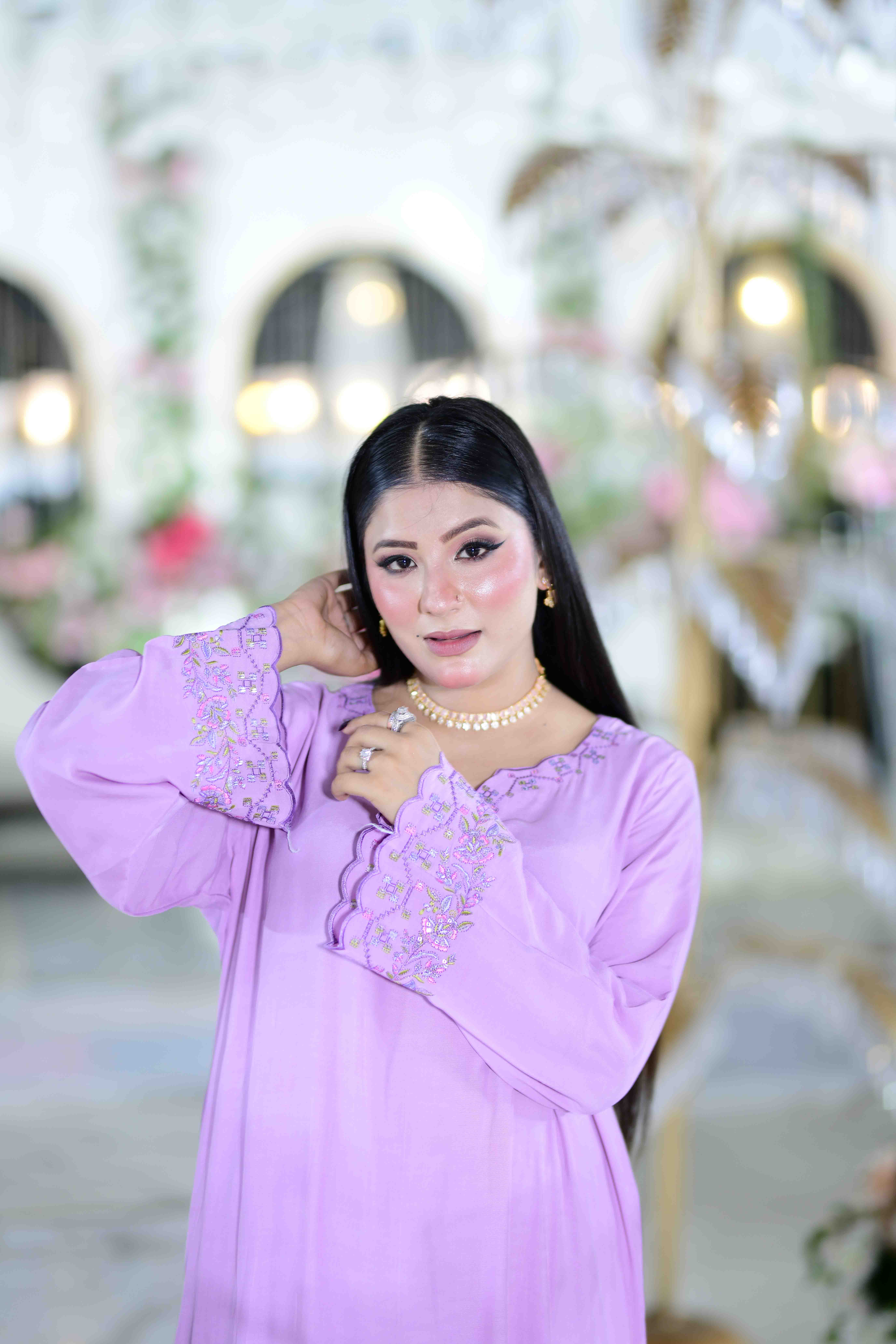 This elegant ensemble is a celebration of traditional Pakistani fashion, crafted from premium Rayon Silk imported from China, offering a soft, luxurious feel and graceful drape. The Lalich lavender hue adds a refined and serene charm, ideal for formal and festive occasions.