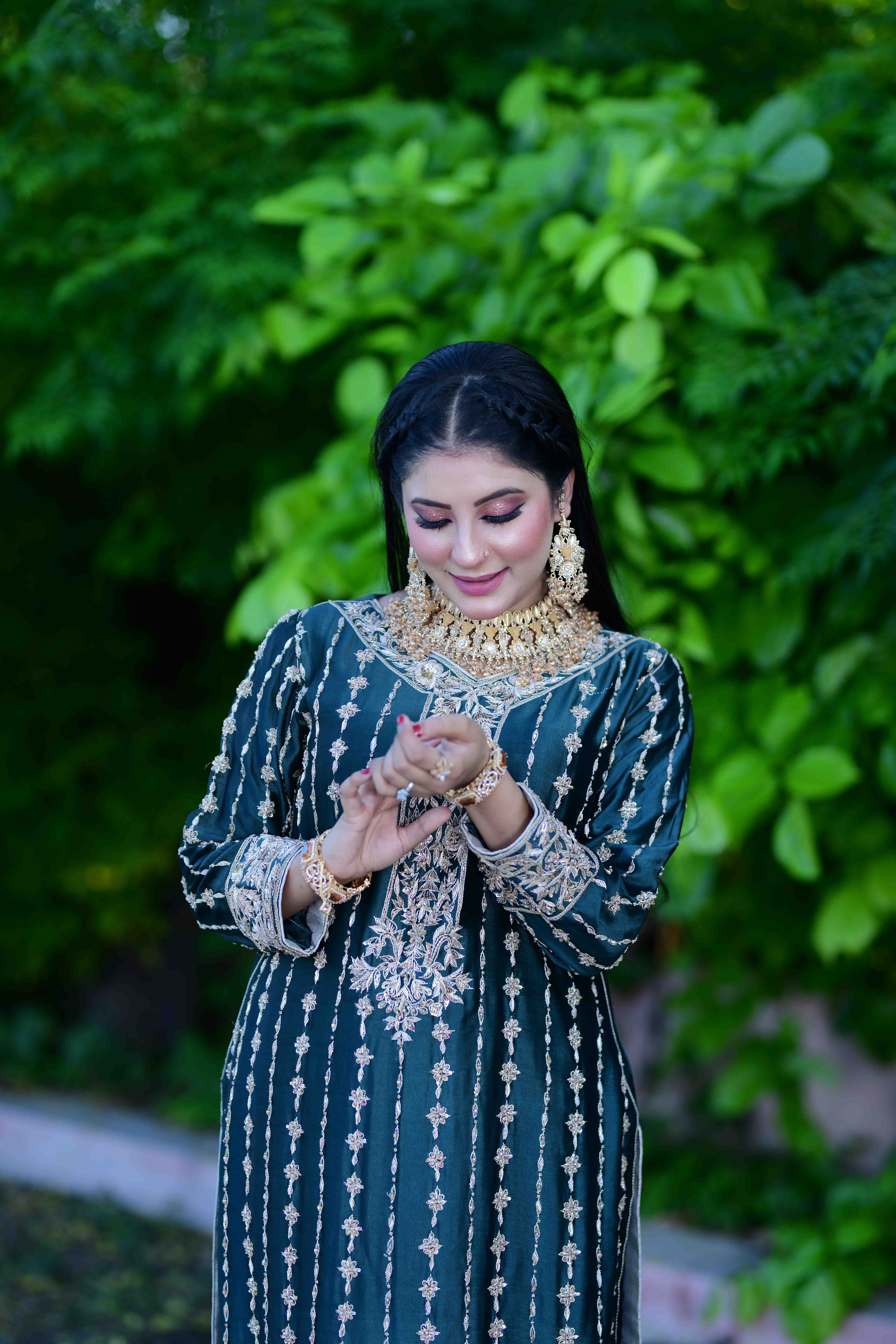 This luxurious three-piece outfit features a long shirt crafted from premium tassel silk, adorned with intricate handmade embroidery including kora, dabka, and nakhsi work. The emerald green hue is complemented by rich gold floral and vine motifs along the neckline, front panel, cuffs, and hemline. Vertical embroidery stripes add a refined touch to the silhouette. The raw silk trousers in a matching shade of green feature coordinating embroidery at the hemline for a cohesive look. The medium silk dupatta completes the ensemble with its soft texture and subtle sheen, making it ideal for festive occasions and formal gatherings.