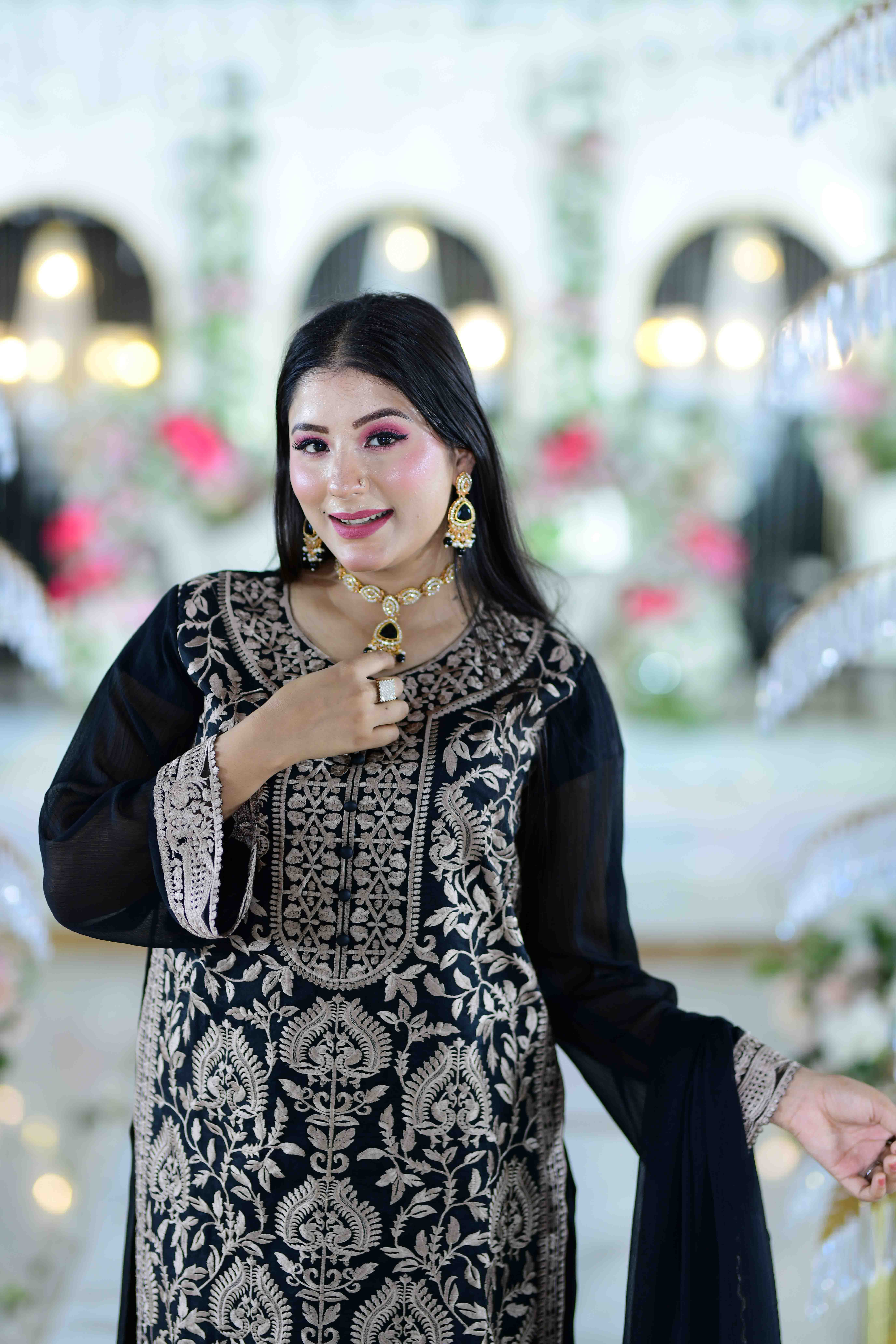 This sophisticated ensemble blends timeless tradition with modern elegance. The crinkle chiffon shirt features a soft, textured flow and is beautifully adorned with premium silver floral embroidery across the neckline, sleeves, and front. The viscose silk trousers offer a sleek, tailored fit, adding comfort and refinement. The crinkle dupatta completes the look with matching embroidery, enhancing the outfit’s cohesive and graceful appeal.