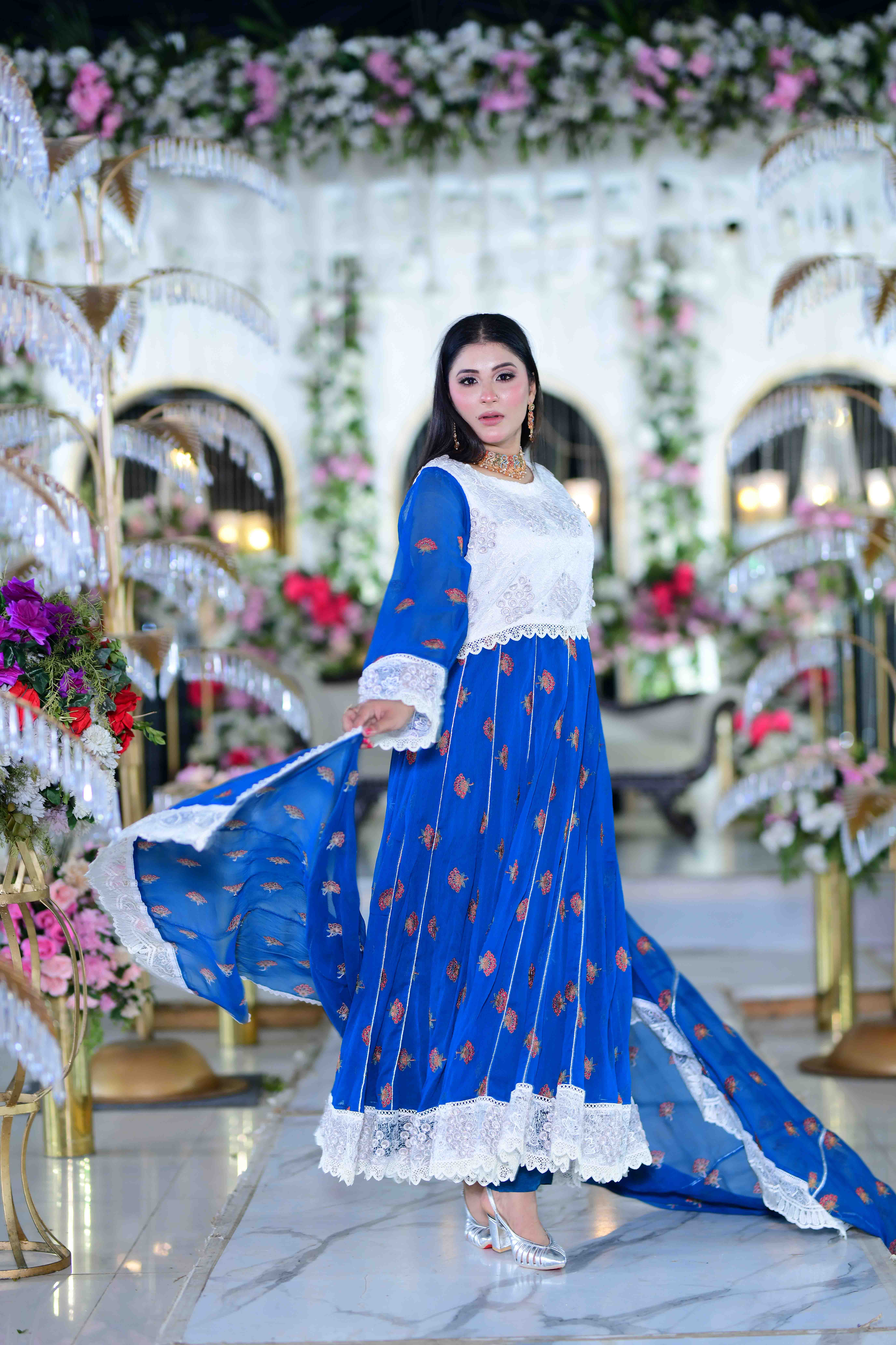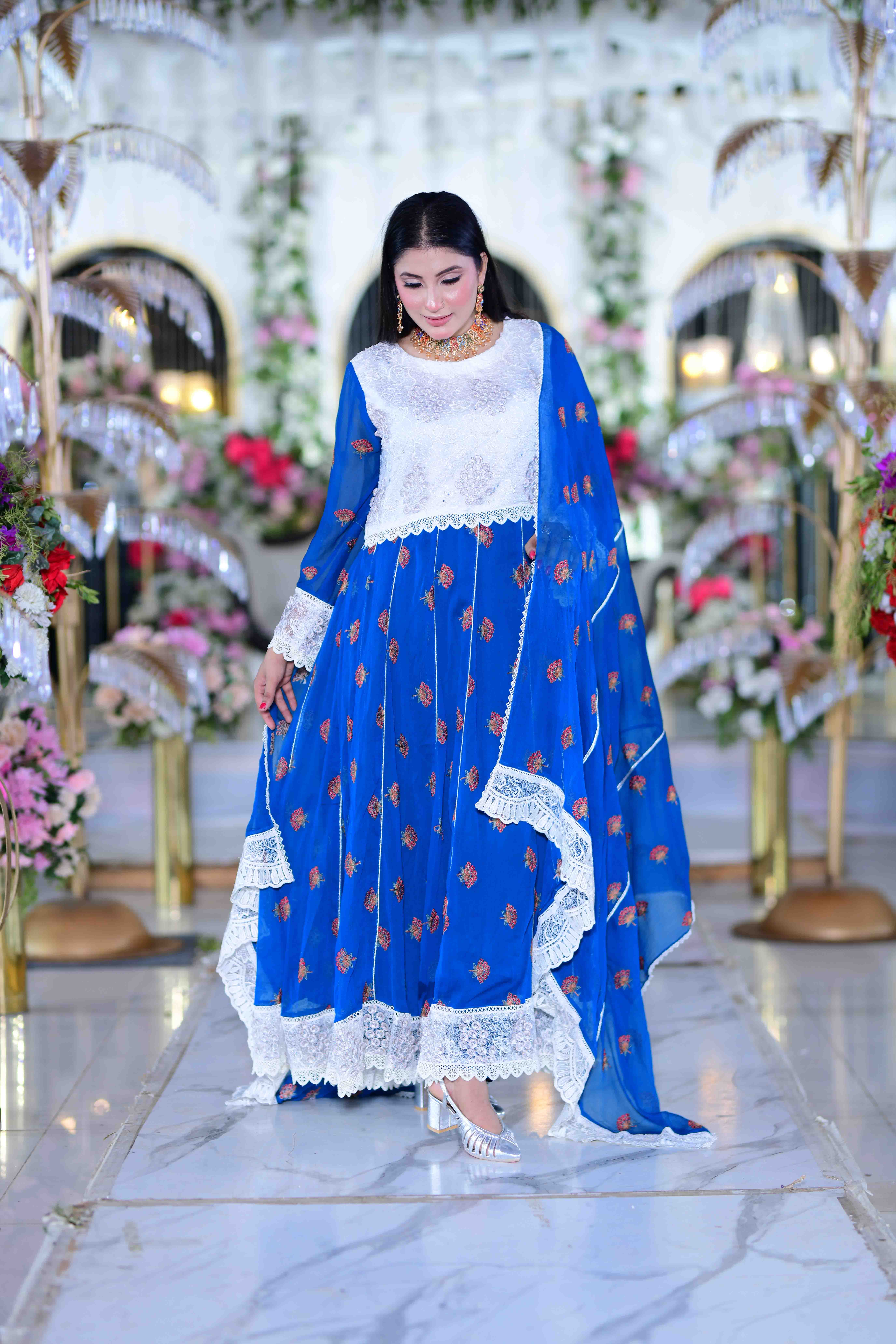 This exquisite pishwas frock set is a celebration of traditional elegance and refined craftsmanship. The frock is tailored from premium crinkle chiffon in a rich royal blue shade, featuring antique panel work and delicate embroidered lace that adds timeless charm. Paired with black viscose silk trousers and a matching crinkle chiffon dupatta, this ensemble is perfect for festive and formal occasions.