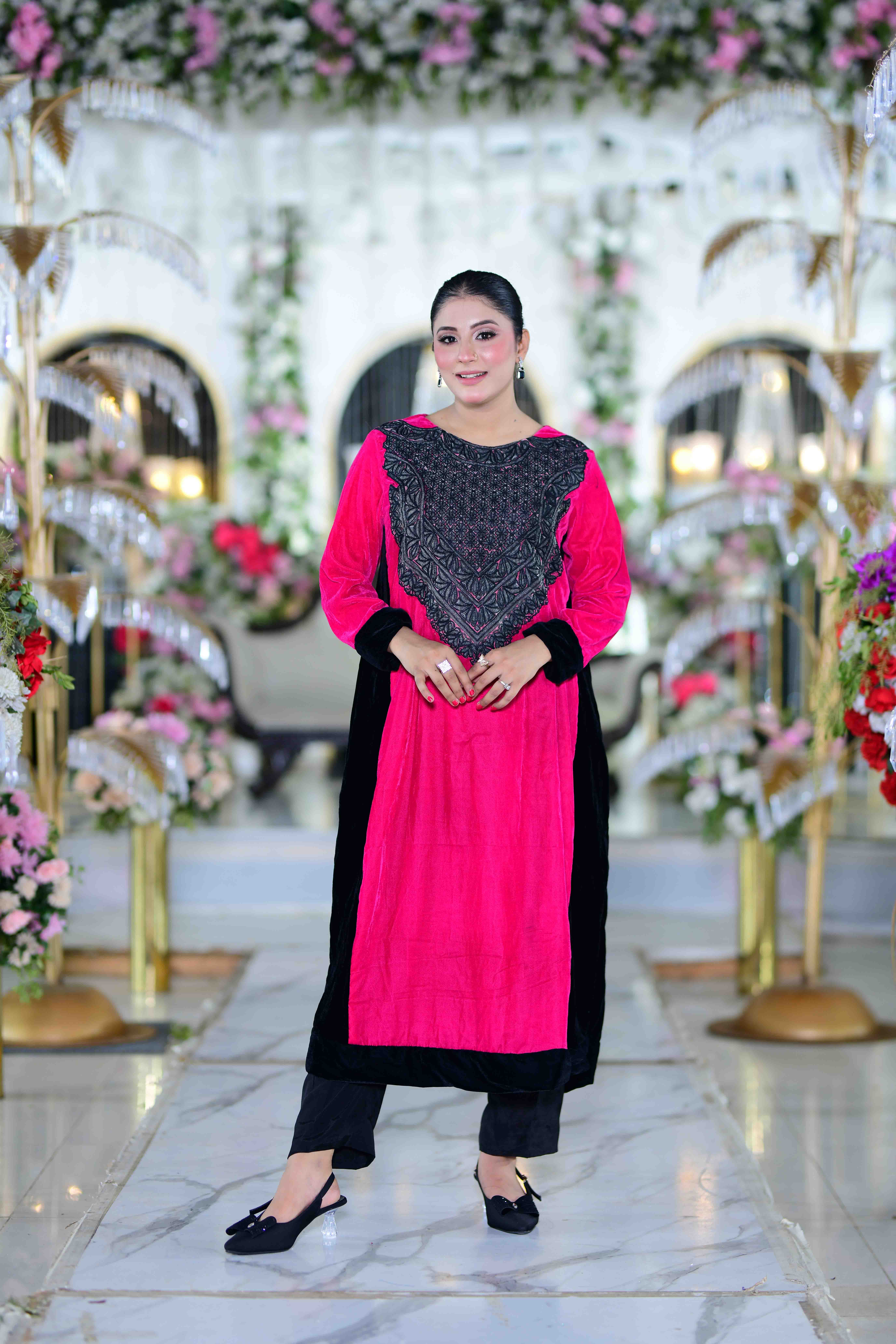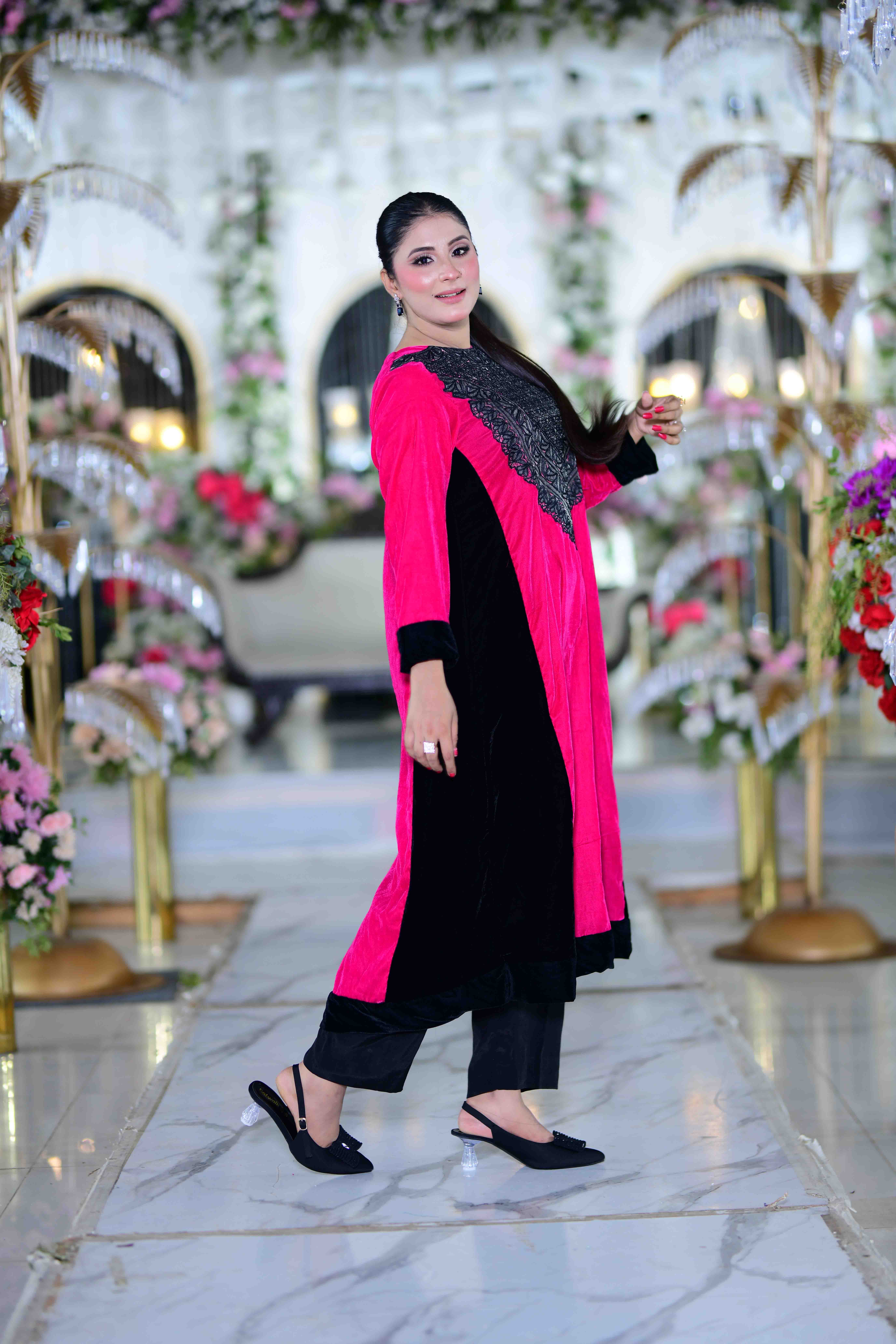 This sophisticated Pakistani long shirt set is a perfect fusion of traditional elegance and modern luxury. The shirt is tailored from imported China phoenix velvet in a striking pink shade, beautifully contrasted with antique black satin embroidery that adds richness and depth. The black viscose silk trousers offer a sleek silhouette and comfortable wear, making this ensemble ideal for formal and festive occasions.
